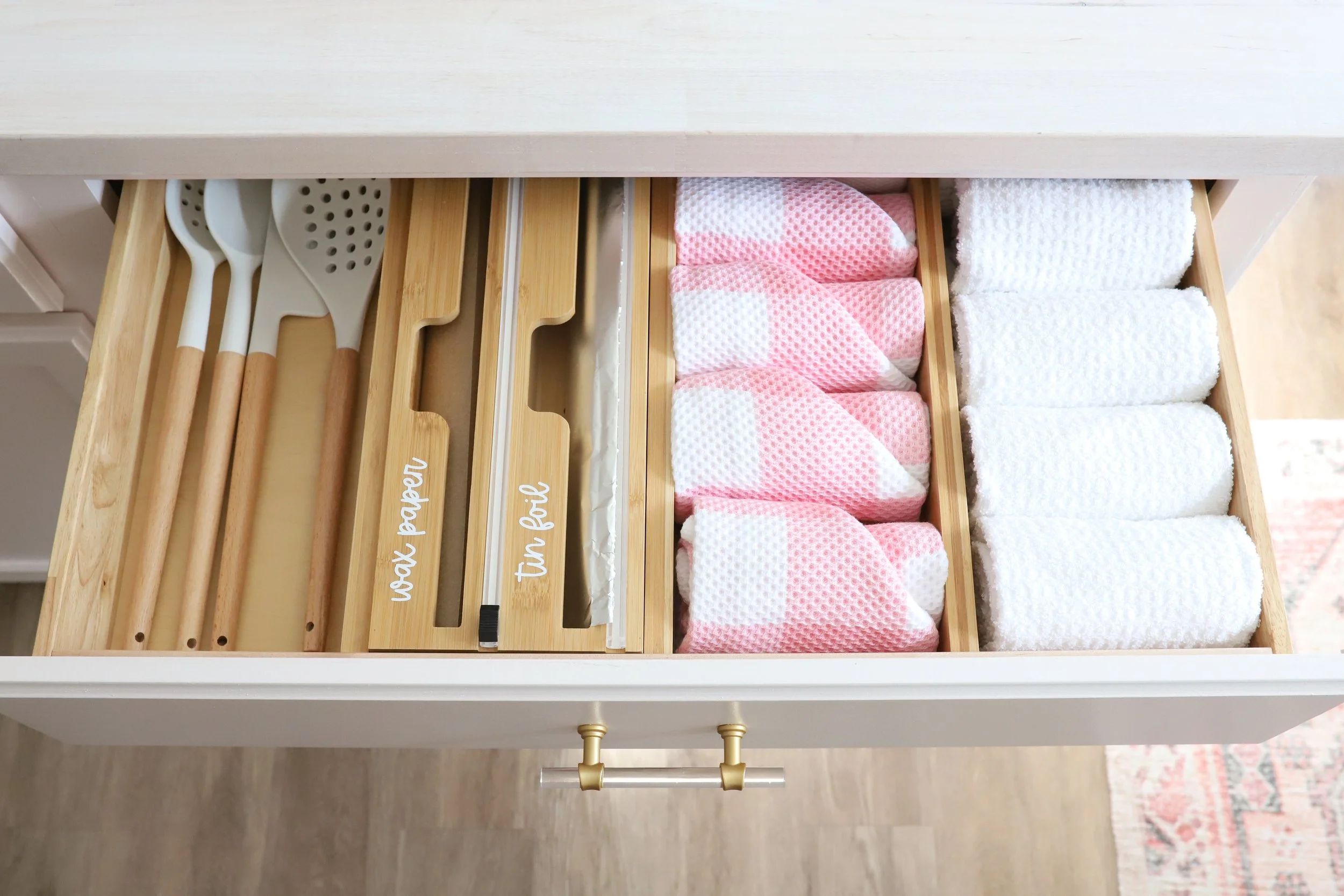 kitchen drawer organization Apr 20 Written By Mae Richter Source: Bamboo Foil Holder / Utensils / Pink Towels / Drawer Pulls Mae Richter